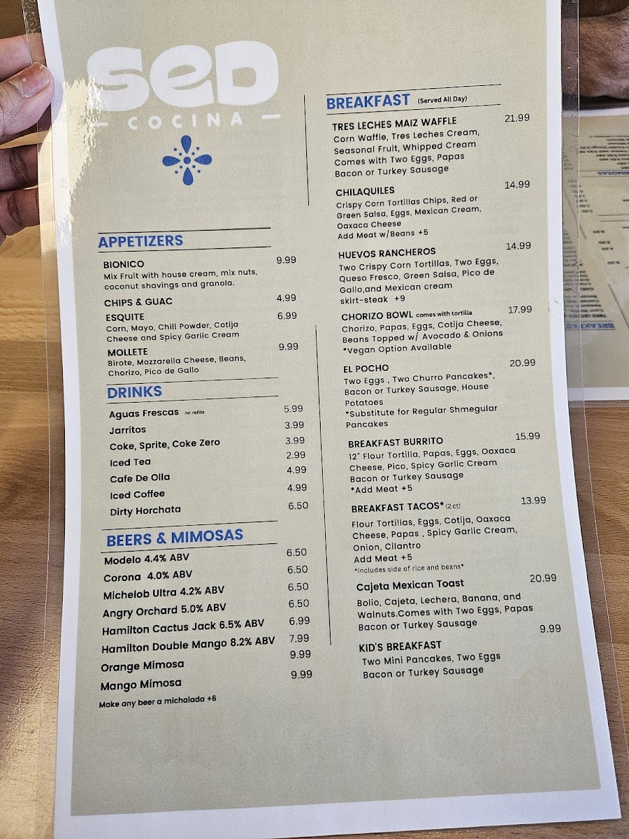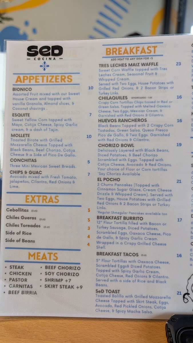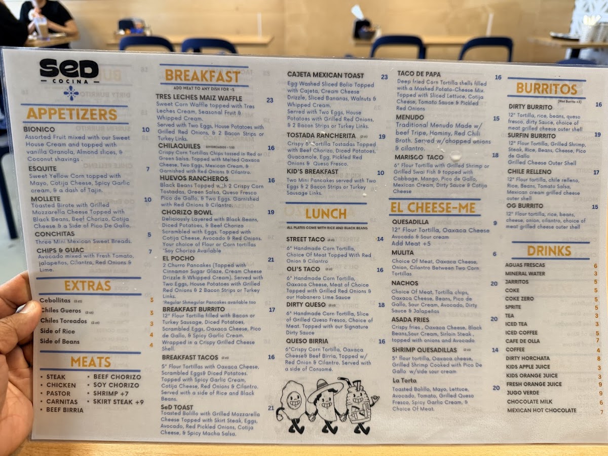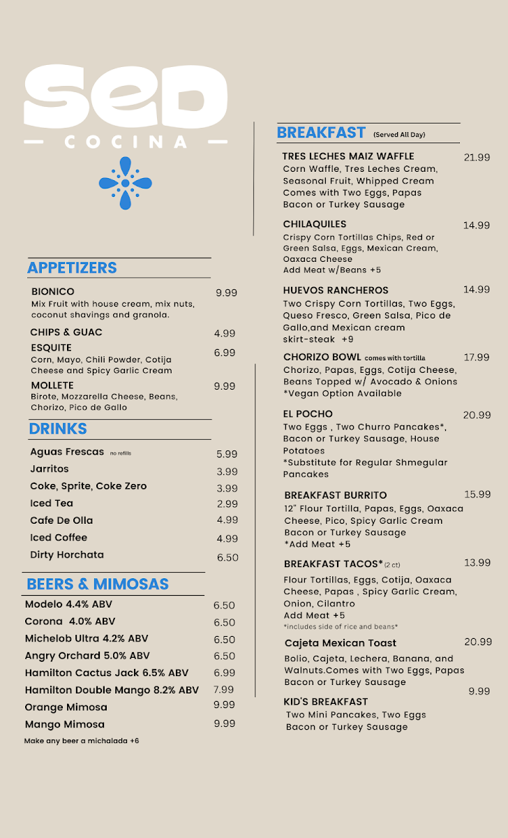 SeD Cocina offers a menu that blends hearty Mexican breakfast and brunch favorites with casual, comforting bites ideal for a laid-back morning or midday meal. Whether you're stopping by for a thoughtful breakfast or catching up with friends over brunch, the menu features a variety of satisfying choices designed to pair well with the warm, inviting atmosphere.